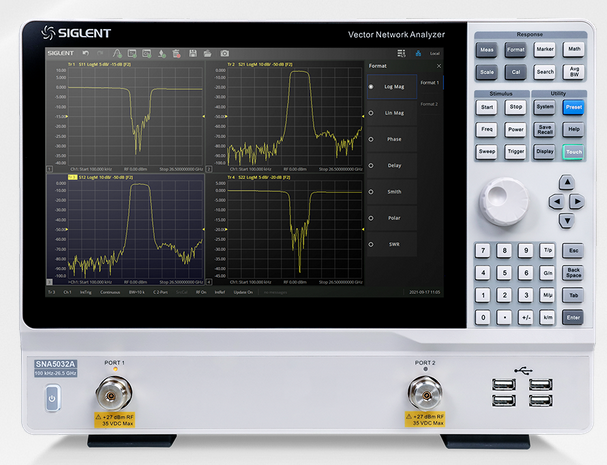 除開(kāi)外觀設(shè)計(jì),其先進(jìn)的用戶界面,配合上12.1英寸超大觸摸屏與外接的鼠標(biāo)和鍵盤,讓工程師能更快的添加或刪除窗口,通道和跡線。SNA5000A支持在多個(gè)窗口下,添加多條跡線進(jìn)行S參數(shù)測(cè)量。并且測(cè)量結(jié)果,可以多種數(shù)據(jù)格式顯示,如 Log Mag,Lin Mag,Phase,Delay,Smith,SWR,Polar等,可以方便快捷地分析被測(cè)物的傳輸系數(shù),反射系數(shù),駐波比,阻抗匹配,相位,延時(shí)等參數(shù)。