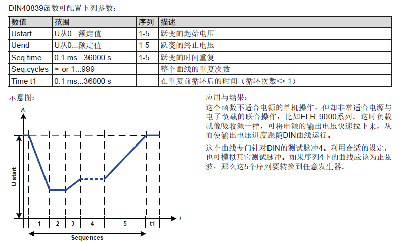 拿PSI 9000系列的產(chǎn)品舉例,其內(nèi)置有函數(shù)發(fā)生器功能,其中有一個(gè)DIN40839函數(shù),是基于DIN 40839 / EN ISO 7637()定義的曲線,且只能應(yīng)用到電壓數(shù)值上。它會(huì)復(fù)制汽車引擎啟動(dòng)期間電池電壓的進(jìn)展。