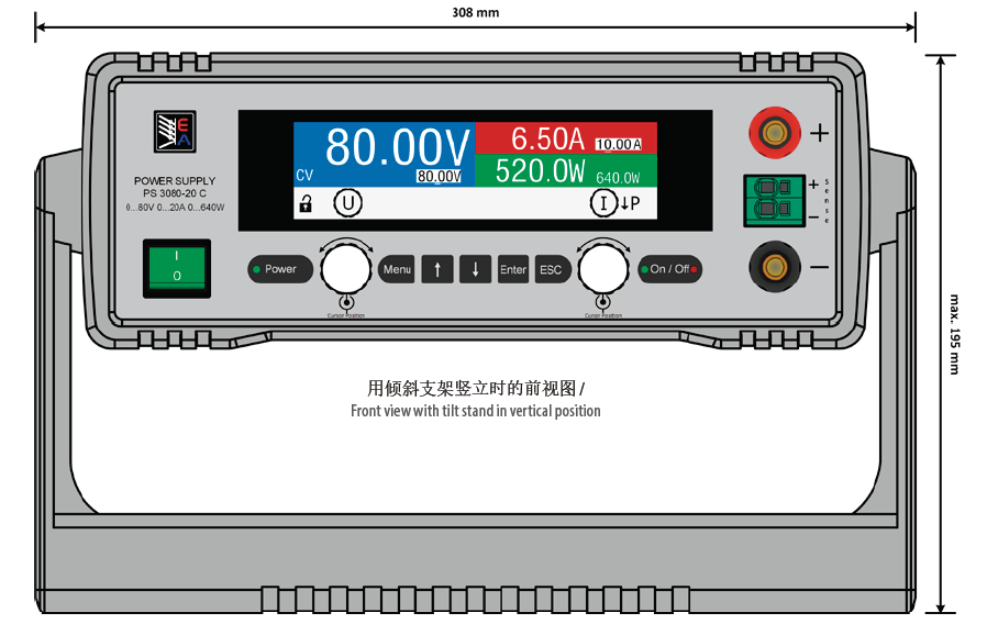 本系列有0...40 V和0...200 V輸出電壓,0...2 A和0...40 A輸出電流,0...160 W和0...640 W輸出功率的不同型號。因此不管是手動控制還是遠程控制(模擬或數(shù)字),都可在0%與100%之間連續(xù)調(diào)節(jié)電流、電壓與功率。輸出端位于產(chǎn)品前面板上。