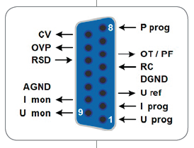 產品后板上裝有一隔離模擬接口端子。它具有一模擬輸入腳,接上0 V...10 V或0 V...5 V電壓,可設置0...100%的輸出電壓、電流與功率。要監控輸出電壓與電流,可給模擬輸出腳接上0 V...10 V或0 V...5 V電壓來完成。此外,還有幾個輸入腳和輸出腳,可用來控制和監控產品狀態。