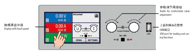 設定與實際輸出電壓、電流與功率都清晰顯示于圖形顯示器上。彩色的TFT屏幕為點觸式,用一個手指就能控制所有功能。