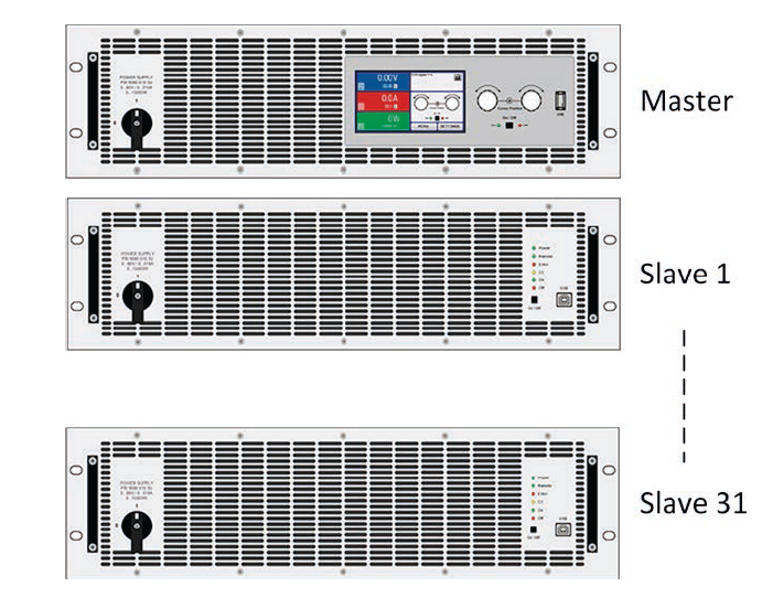 本系列15 kW型號的功率可以擴展至480 kW,合并所謂的從機系列EA-PSI 9000 WR 3U Slave可以實現。它們需在主-從模式下運行,并與本系列的一個型號作為主機并聯。一個該系統總共可以擴展32臺機器。按需求,我們可以提供全部配置好即時使用的機柜,也可供多機柜系統。